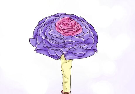 Form your shape as you move upward. Regardless of the shape you're creating, use one flower at a time. Insert the stems of your flowers into the bouquet, gradually building the shape you want. Always work around the square-shaped base you created in order to achieve your desired shape. You can form the shape you want as you add flowers. If you're opting for a traditional bouquet, form a dome shape. If you want a cascade shape, attach the flowers to the base by the very edges of the stems, so the flowers spill outward and create the waterfall effect. Keep the look you want in mind in regards to color as well. If you want a very uniform bouquet, match flowers based on color and size. If you want a less stringent bouquet, vary the types of flowers. Pair light ones next to dark ones, for example.