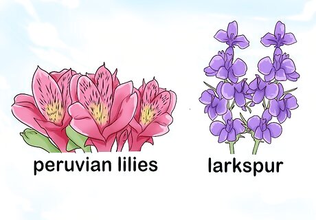 Find purple flowers that are always in season. Season is important for your wedding. Flowers that are out of season may be harder to find and more expensive. To help with this problem, try to include a few purple flowers that are always in season. Peruvian lilies are lovely light purple flowers. They are in season year-round. Larkspur come in shades of deep purple and are in season year-round. Calla lilies are not purple, but can come in light pinks that could compliment a purple bouquet. They are also in season year-round.