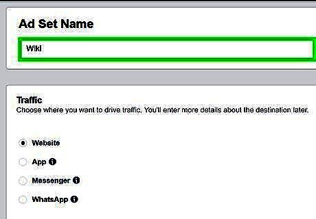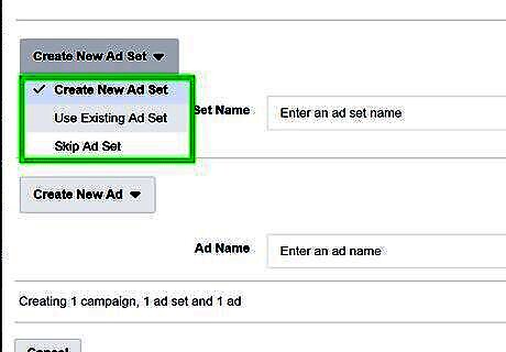 Type a name for your Ad Set. Use the text box next to "Ad Set Name" to type the name of your ad set. If you want to use an existing ad set, click the drop-down menu that says "Create New Ad Set" and select Use Existing Ad Set. Then select the ad set you want to use. You can also select "Skip Ad Set".