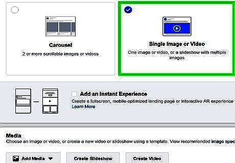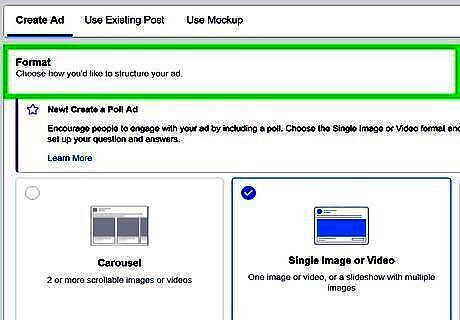 Choose an ad format. You can choose one of two ad formats: a single image or video, or a carousel. A carousel contains multiple scrollable images or videos.