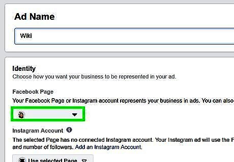 Select a Facebook page and/or Instagram account. Use the drop-down menu below "Facebook Page" and "Instagram account" to select a Facebook page or Instagram account associated with your ad. You can also click Create a Facebook page or Add an Instagram account page to create a new business Facebook page or add an existing Instagram account.