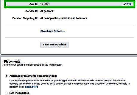 Select a target audience age. There are two drop-down menus next to "Age". Use the first one to select the minimum age you want to target with your ad campaign (i.e. 18). Use the second drop-down menu to select the oldest age group you want to target with your ad campaign (i.e. 50).