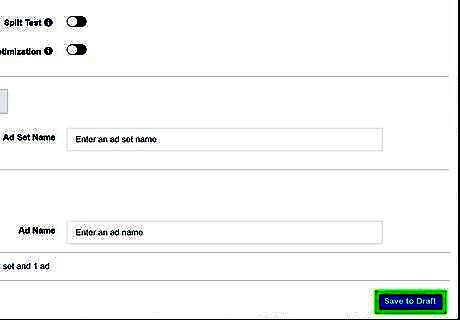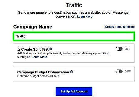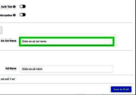 Scroll down and type a campaign name. By default, your ad campaign is named after the objective you select. If you want to name it something else, type it in the box next to "Campaign Name". If you wish to create more than one campaign and test your ad sets against each other, click the toggle switch next to "Create Split Test". If you wish to optimize your budget across all ad sets, click the toggle switch next to "Campaign Budget Optimization".