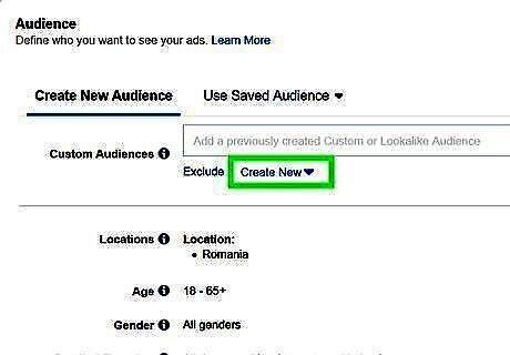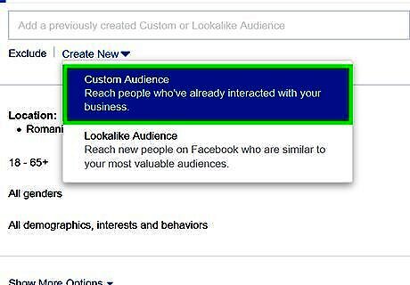 Click Create New to create a new audience. It's below the text bar that says "Custom Audience". If you already have a Custom or Lookalike audience, you can click the text box and then select it from the list.