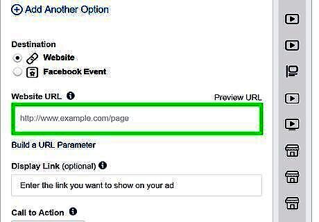 Add a website URL (optional). If you want to add a URL to an external website, click the checkbox next to Add a website URL and then complete the following steps. Add the URL for your website in the box labeled "Website URL". Type how you want the link text to appear in your ad in the second text box. Type a headline in the box labeled "Headline". Type a newsfeed description in the box. Use the drop-down menu to select a call to action.