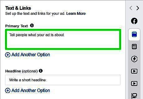 Type the text for your add. Use the box labeled "Text" to type the text or ad copy text. This can be a briefs sales pitch or a call to action.