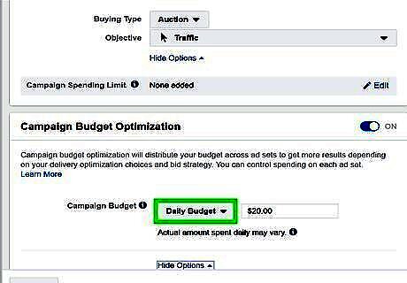 Set a budget (optional). If you have "Campaign Budget Optimization" turned on, you can use the drop-down menu next to "Campaign Budget" to select Daily Budget or Lifetime Budget. Then type the total budget in the box next to the drop-down menu.