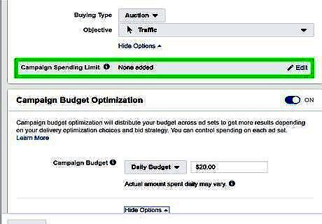 Set a campaign spending limit (optional). To create a campaign spending limit, click Set a Limit next to "Campaign Spending Limit" and then enter the dollar amount you want to limit your campaign spending to in the box. The spending limit must be at least $100.