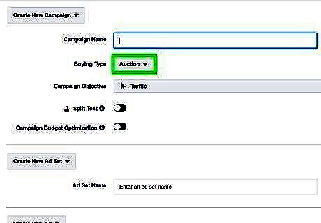 Select a buying type. Use the drop-down menu next to "Buying Type" to select an ad-buying strategy for your campaign. Your options are as follows: Reach and frequency: This option allows you to buy campaigns in advance and gives you more control over your frequency settings (this option may not be available for all campaigns). Auction: This option gives you more choice, efficiency, and flexibility, but with less predictable results.