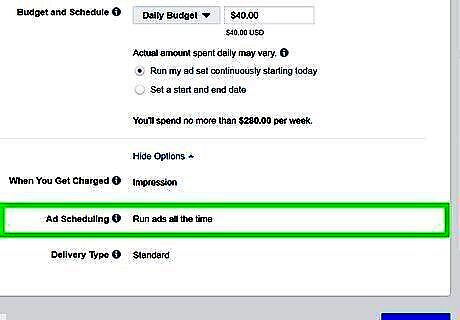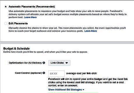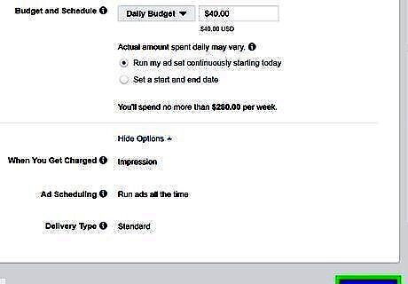 Set a budget. Use the drop-down menu next to "Budget and Schedule" and select Daily Budget or Lifetime Budget. Then type the total budget in the box next to the drop-down menu.