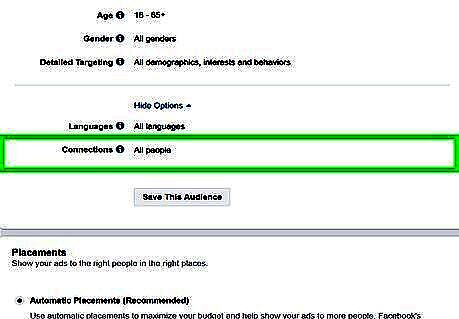 Select a connection type. Use the drop-down menu next to "Connections" to select a connection type. You can choose to include or exclude people (and their friends) who like your page, people who use your app, or people who responded to an event you created.