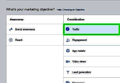 Select a campaign objective. There are a variety of objectives for you to choose from. Click the one that is right for you. Your options include the following; Brand awareness: Select this option to reach people who are more likely to be interested in your brand. Reach: Select this option to have your ad viewed by the highest number of people. Traffic: Select this option to direct people to a Facebook page or website. Engagement: Select this option to promote a Facebook post, event, offer, or just to get more likes. App installs: Select this option if you are an app developer to promote your app. Video views: Select this option to promote video content. Lead generation: Select this option to create a form that allows you to get contact information from people who are interested in your brand or business. Messages: Select this option to drive more messages to your business through Messenger or WhatsApp., Conversions: Select this option to encourage people to complete specific actions on your website, app, or in Messenger. Catalog Sales: Select this option to create an ad that shows items from your catalog. Store traffic: Select this option to promote your physical store by showing ads to people in the area.