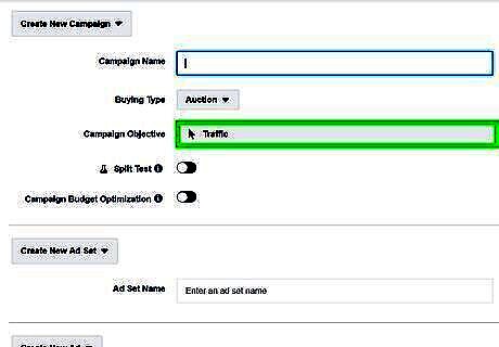 Select a campaign objective. Use the drop-down menu next to "Campaign Objective" to select an objective for your campaign. Your options are as follows: Brand awareness: Select this option to reach people who are more likely to be interested in your brand. Reach: Select this option to have your ad viewed by the highest number of people. Traffic: Select this option to direct people to a Facebook page or website. Engagement: Select this option to promote a Facebook post, event, offer, or just to get more likes. App installs: Select this option if you are an app developer to promote your app. Video views: Select this option to promote video content. Lead generation: Select this option to create a form that allows you to get contact information from people who are interested in your brand or business. Messages: Select this option to drive more messages to your business through Messenger or WhatsApp., Conversions: Select this option to encourage people to complete specific actions on your website, app, or in Messenger. Catalog Sales: Select this option to create an ad that shows items from your catalog. Store traffic: Select this option to promote your physical store by showing ads to people in the area.