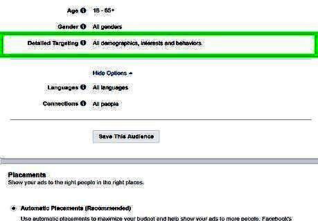 Add a target demographic, interest, or behaviors. If you want to include more detailed targeting to your ad campaign, use the text box next to "Detailed Targeting" to type the names of demographics, interests, or behaviors. To exclude certain demographics, interests, or behaviors from your detailed targeting, click Exclude people below the "Detailed Targeting" text box and then use the new text box to type the names of the demographics, interests, or behaviors you want to exclude.