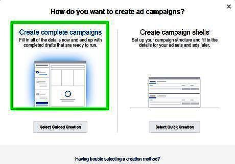 Click Create Complete Campaigns. It's the first box on the left. This option walks you through the process of creating a Facebook ad campaign and your first ad. Alternatively, you can click Create Campaign Shells and follow the instructions to create a basic campaign that allows you to create ads at a later date.