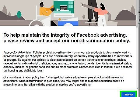 Click I accept. It's the blue button in the lower-right corner. This indicates that you agree to Facebook's nondiscriminatory ad policy. You only have to agree to this the first time you log into Facebook's ad manager.