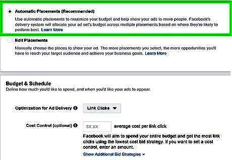Select your ad placements. To allow Facebook to optimize your Facebook ad placement, select Optimize for Per Cost Result. If you want to select where your ad placement goes, click Edit Placements and then click the checkbox next to places you do not want your ad to appear. You can also select if you want the ad to appear on mobile, or desktop, or both.