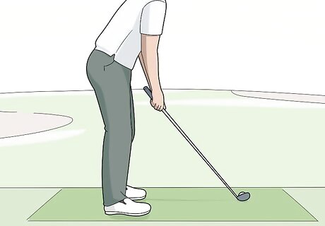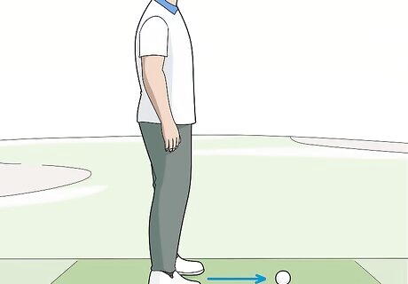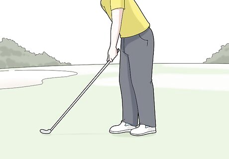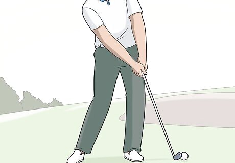 Bend forward from your hips and place the clubhead behind the ball. Hold a golfclub loosely and lean forward at your hips toward the ball on the ground. Rest the head of the club on the ground just behind the ball. You should not feel like you have to reach to place the club behind the ball. Hinge at your hips to lean forward so you don’t put strain on your lower back.Pro Tip: As a general rule, the butt of the grip should be about 6 inches (15 cm) away from your body when you line the clubhead behind the ball for you to be the proper distance away from the ball.