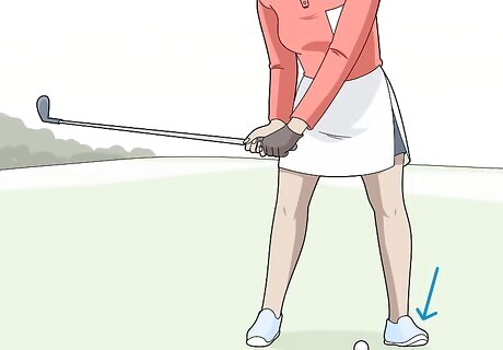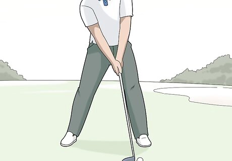 Face the ball and take a balanced stance with a slight bend in your knees. Stand with the golfball on the ground in front of you and the side of your body aiming in the direction you want to hit it. Place your feet so they’re about shoulder-width apart and take a slight bend in your knees so you can rotate your body. Try to take a relaxed posture so you can swing more fluidly. Your weight should be evenly distributed in both feet so you aren’t leaning forward or backward.
