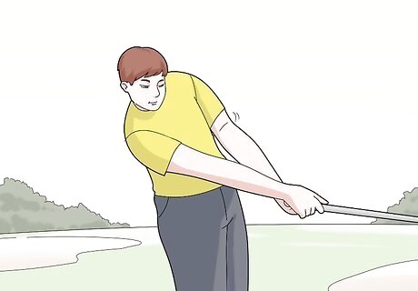 Unwind your hips and keep your lead arm connected to your chest as you swing. As your hands pass in front of your body, rotate your hips in the direction that you’re swinging. Hold your lead arm straight and connected to your chest to maintain the angle in your wrists. Keep your eye on the ball and strike it with the clubhead as you swing. The clubhead will lag behind your arms and hands, which generates more power at the point of impact on the ball. Keeping your eyes on the ball will prevent you from leaning forward or picking up your head, which can cause you to miss the ball or hit it poorly.