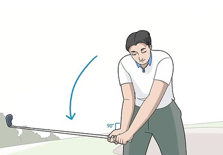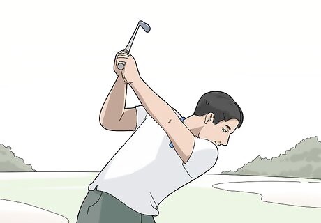 Keep your lead arm straight and flex your wrists as you bring the club overhead. Lock the elbow of your lead arm to hold it straight while you bring the club overhead for your backswing. As the club travels further behind you, flex your wrists so they form a 90-degree angle, which will allow the clubhead to travel further behind your body. Increasing the distance the clubhead travels behind you allows you to add more power and torque to your swing.