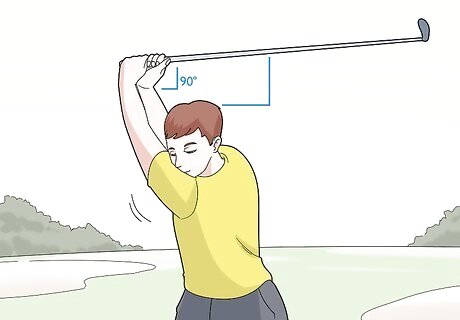 Bring the club overhead and form a 90-degree angle with your wrist and club. Start your backswing by bringing your arms behind you, keeping your lead arm straight. When you reach the top of your backswing, hold the position and form a right angle, or a 90-degree bend, with your wrists so the club is pointing in the direction you’re aiming. Take note of what the angle feels like on your wrists so you can replicate it when you’re hitting a golf ball. The extra distance between your hands will force you to exaggerate the bend in your wrists so you can feel what the correct angle feels like in each of them individually.Pro Tip: Have a friend or golf pro observe your wrist angle to make sure it’s correct and to make adjustments as you hold it.