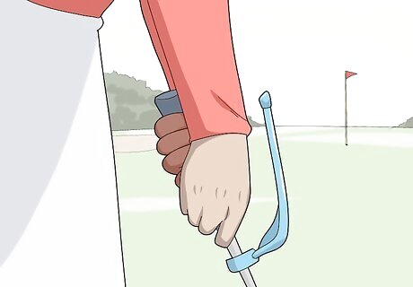 Hold the club toward the top of the grip with your non-dominant hand. Use any iron club and rest the clubhead on the ground. Place your non-dominant hand beneath the grip, near the top end of it. Wrap your fingers and thumb around the grip so you’ve got a sturdy hold on the club. Take a grip that isn’t so strong that you can’t bend or flex your wrists when you swing.
