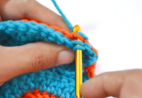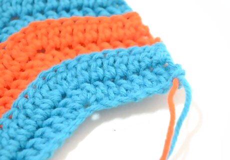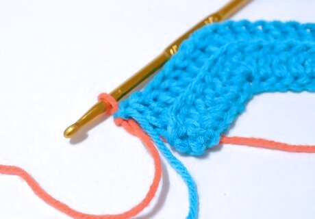 Change to yarn B. Switch to your second yarn color before beginning the third row. Loosely loop yarn B around the tip of the hook, just above the loop already on your hook. Leave a 4-inch (10-cm) tail of yarn B. Pull the yarn B yarn-over through the yarn A loop on your hook. A should be removed from the hook, leaving a loop of B in its place. Cut yarn A, leaving a 4-inch (10-cm) tail to weave in later.