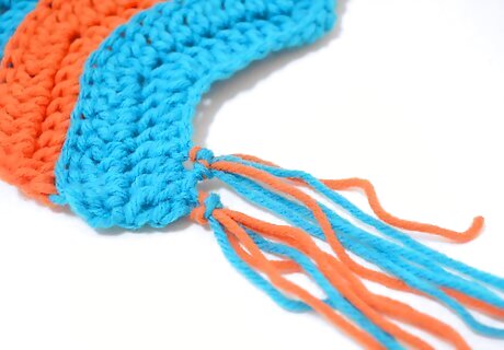 Fasten off the yarn. Cut the yarn, leaving a 4-inch (10-cm) tail. Pull this tail through the loop on your hook to bind off the end. At this point, it's a good idea to weave this tail and all other tails into the back of the scarf. If desired, you can leave the scarf in its current state and wear it as is. The decorative fringe is recommended, but not strictly necessary.