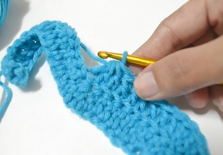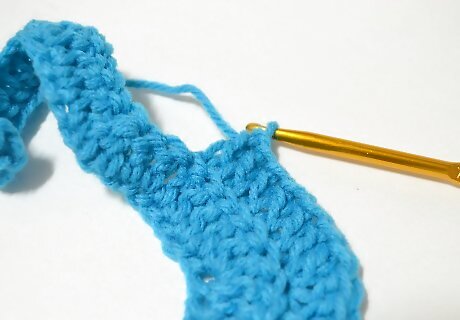 Work another series of double crochet. You will need to double crochet into the back loops of each of the next 13 stitches, but the number of double crochets made into each stitch will vary. Double crochet once into each of the next six stitches. Double crochet three times into the stitch that follows. Double crochet once into each of the following six stitches, too.
