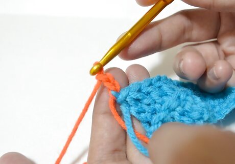 Double crochet into the third chain. Work one double crochet into the third chain currently from the hook. When counting chains, do not include the loop currently on your hook. To work a double crochet stitch: Yarn over the hook. Insert the hook into the stitch. Yarn over the hook. Pull this yarn-over and the hook back to the front, drawing up a loop in the process. Yarn over the hook. Draw this yarn-over through the first two loops already on your hook. Yarn over the hook again. Draw this yarn-over through the final two loops on your hook.