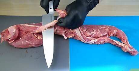 Remove the silver skin from the tenderloin. The layer of fat that remains on the top side of the main tenderloin is known as the “silver skin.” Remove this additional fat to ensure that your filets are tender. Slide your knife under the fat layer and run it down the length of the meat. Minimize the loss of meat by flipping the tenderloin so that the silver skin is against your cutting board. Then, run your knife between the fat layer and the tenderloin.