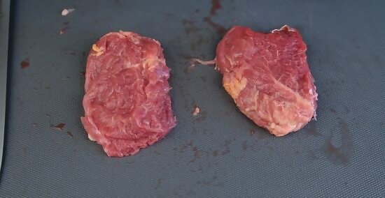 Shape the filets into 1–2 in (2.5–5.1 cm) thick steaks. Flip the filets so that they are sitting on your cutting board, cut side down. Use your dominant hand to firmly grasp each cut in turn, pushing it gently against the cutting board to flatten it, rounding it out as you go with gentle and even pressure. The filet mignon and the cuts from the head need the most attention as they are cut from thinner sections of the tenderloin. Flattening, widening, and rounding out these portions will allow you to cook them evenly along with the other filets.