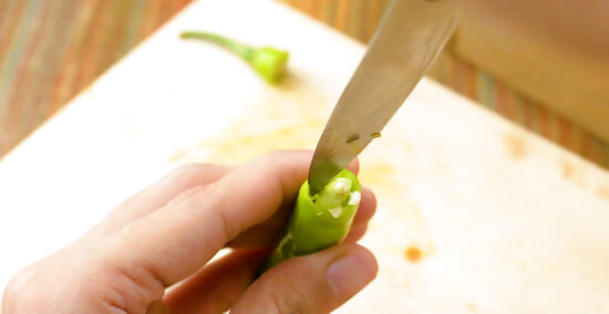 Scoop the seeds and core out if you wish to reduce the heat. Set the halves with the cut ends up on your cutting board. If you have a melon baller or a small spoon, you could use it to easily clean out the inside of each half. Otherwise, use your gloved hand to pull out the seeds and a paring knife to scrape off any of the white core left on the pepper’s flesh. The heat in peppers comes from that white core membrane holding the seeds in place. Once you remove it, the pepper loses most of its heat, so leave it in place if you don’t mind spicy food!