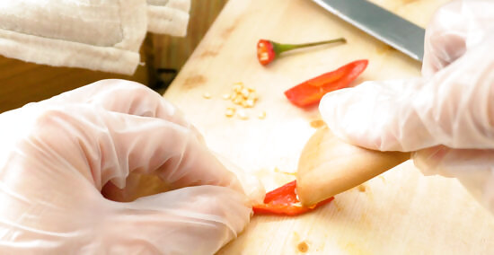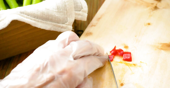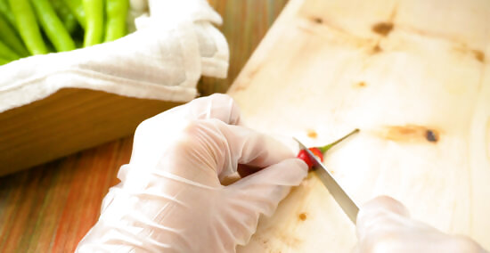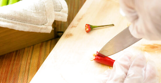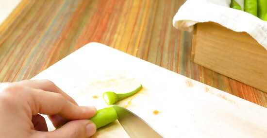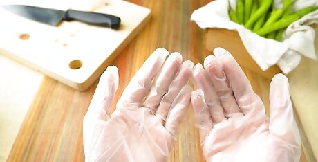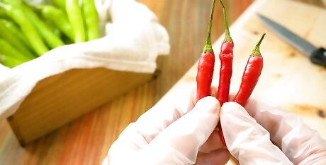 Wear rubber gloves to protect yourself from the heat. Pepper juice stings, and many people become acquainted with the burn the first time they open a hot pepper. The only way to protect yourself from the hot stuff is by putting on disposable kitchen gloves before you ever pick up the peppers. Remember to avoid touching any other part of your body before taking off the gloves. Rubber gloves are available online, at most general stores, and at other places that stock kitchen supplies. If you’re unfortunate enough to experience pepper burn, try using a little rubbing alcohol or milk to neutralize the oil. If you get it in your eye, rinse only with water or saline.