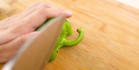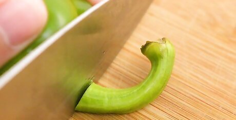Slice ⁄2 in (1.3 cm) off the top to remove the stem. Use a sharp chef’s knife or consider switching to a paring knife to handle smaller peppers. Then, make a single horizontal cut across the pepper. Cut all the way through the entire pepper to remove the stem. If you’re cutting up a bell pepper, also slice off the bottom end the same way. Doing this gives you more uniform rings. The parts you cut off aren’t good for making rings. Instead, you could remove the stem and save the remaining flesh for a snack or another dish.