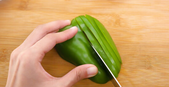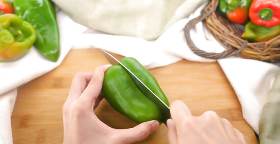 Slice the pepper in half vertically to open it. Hold the pepper still with your free hand so you are able to cut completely through it. One cut along the pepper's length is all you need to split it. Doing this also divides the seeded core in half but exposes it so you can remove it. If you don’t wish to cut through the core, open the pepper from the top and scoop out the seeds. That is useful if you want to cut the pepper into rings.