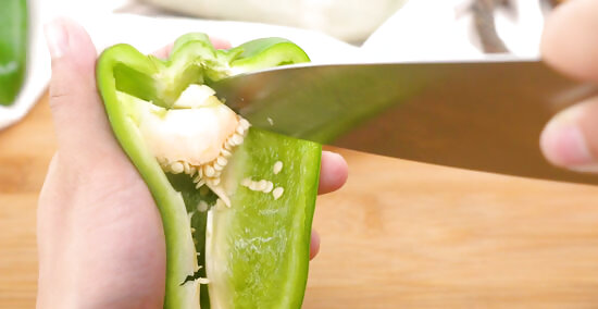 Lay the pepper flat to remove the seeds and ribs. Open the pepper up, resting the skin side down on the cutting board. This gives you a good view of the white core in the center. To remove it, cut across the flesh until you are able to pull the core out. Finish by picking out the remaining seeds and scraping off any white ridges still on the pepper’s flesh. You could switch to a paring knife to help you maneuver underneath the core as you cut it free.