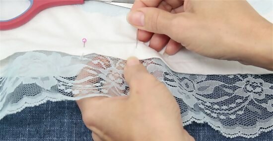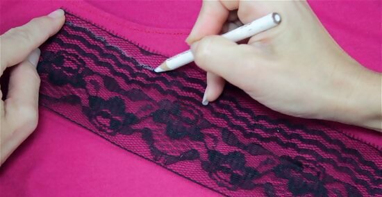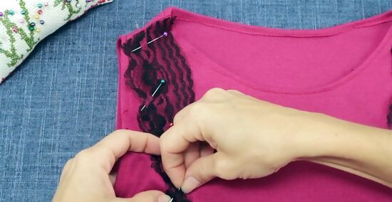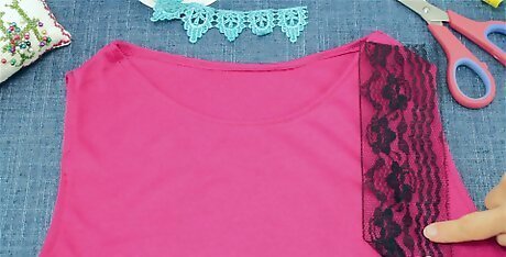 Pin the lace to your shirt. Carefully lay the lace down where you want it to be, then sew it with sewing pins.