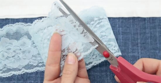 Cut the lace according to those measurements, then cut it in half widthwise so that you end up with 2 equal pieces. Each piece should now be the same length as the bottom hem of your shirt, plus 2 inches (5.08 centimeters). If your lace has a design on it, consider trimming the side edges to follow that design. Be careful not to trim more than 1 inch (2.54 centimeters) off of either side.