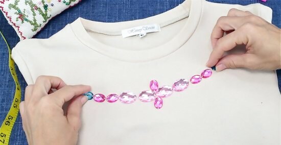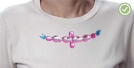 Place your rhinestones where you want them to go. One of the most popular places to put rhinestones (especially chunky ones) is along the collar and/or shoulders, but you can put the rhinestones anywhere you want. A great idea for tiny rhinestones is to make a heart or crown shape with them. If you are sewing the rhinestones on, it might be better to sketch the design out first using tailor's chalk. This way, you won't have to worry about accidentally knocking them aside.