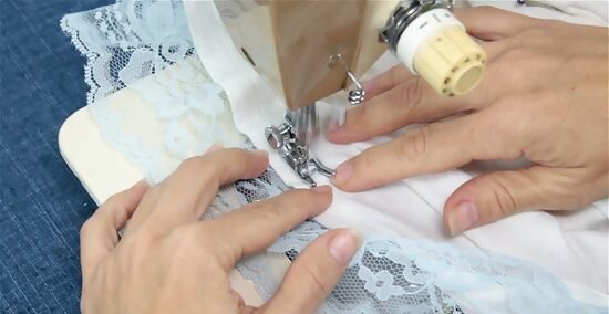 Topstitch the lace down. Most t-shirts will have two lines of topstitching along the hem; try your best to follow one of them using a thread color that matches your shirt. Remove the sewing pins as you sew. If the lace has some stretch to it, consider using a stretch stitch instead. For a more professional finish, use a thread color that matches your shirt, and a bobbin color that matches your lace. This way, the stitching won't be visible on both sides.