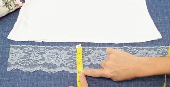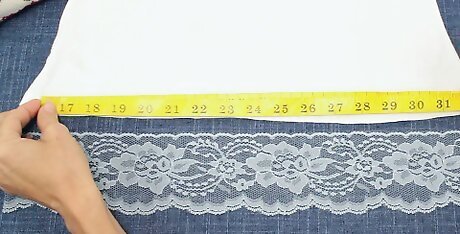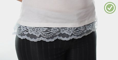 Figure out how long you need the lace to be. The lace needs to be long enough to wrap around the bottom hem of your shirt, plus a few inches. Here is what you need to do: Measure across the bottom hem of your shirt, from left to right. Multiple that number by 2. This will give you enough lace for the back of your shirt. Add 4 inches (10.16 centimeters) for the side seams.
