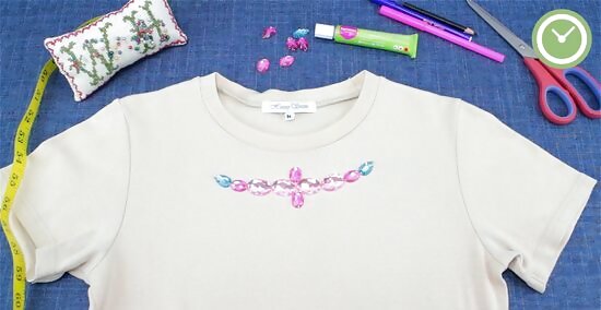 Get a t-shirt. The best type of shirt to use for this would be a plain, solid-colored shirt. Anything with patterns or designs may clash with the rhinestones you will be using. The style of the shirt you get will depend on where you will be placing the rhinestones. In the end, however, the color and style is completely up to you. For example: If you plan on adding rhinestones to the shoulder area, a fitted t-shirt would work best. If you plan on adding large, chunky rhinestones to the collar area, any style of t-shirt would work, especially one with a large/scooped collar.
