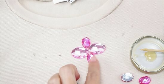 Use a chopstick or popsicle stick to apply some of the glue to the back of a rhinestone. If you are working with a tiny rhinestone, you can use a toothpick or skewer instead. You can also use a pair of tweezers to dip the rhinestone into the glue. In either case, avoid using too much glue, or you will risk it bleeding through the fabric. If you are sewing the rhinestones on, tie the end of the thread into a large knot, then poke it through the fabric, starting from the inside of the shirt.