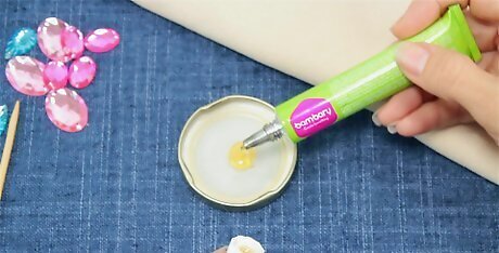 Make a small puddle of glue on a lid or disposable tray. The best type of glue to use for this project would be industrial-strength glue, but a high-quality fabric glue (not "liquid stitch") may also work. If you are sewing the rhinestones on, cut a 12-inch (30.48-centimeter) long piece of thread, and thread a sewing needle. Make sure that the thread color matches the shirt.
