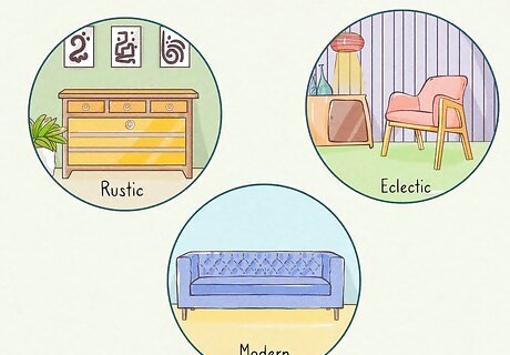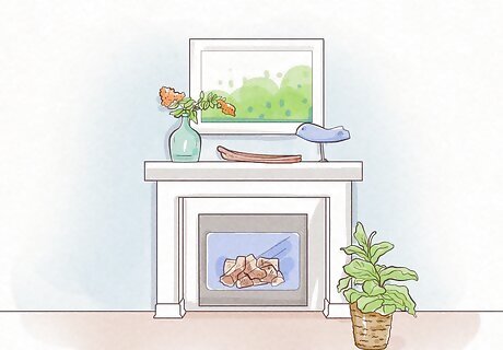 Choose a focal point for the walls. Look at the room to see if any feature grabs your attention when you walk in. Use that focal point as a starting point for hanging decorations or deciding the mood for the room. For example, if you have a large bay window or fireplace, decide if you want the room to be light and airy or dark and rustic. If you don't have a large focal point, keep in mind that items can also be the main attraction in the room. You might have family china that you'd like to arrange on the walls or a beautiful painting that could fill a wall. Alternatively, you create an accent wall with wallpaper or a bold paint color.