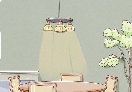 Hang wall sconces for soft lighting. If you'd like warm light along the walls instead of a bright overhead light in the dining room, install several sconces on each wall. Use sconces with clear glass if you want clear, brilliant light. Use sconces with frosted glass or shades if you'd like soft, diffused light. If you hang artwork and would like a formal look, install spot lighting to shine on the piece. Some sconces can be plugged in rather than wired into the wall, making this an inexpensive, easy option.