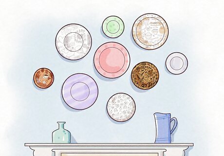 Arrange decorative plates. Select the plates or China you want to display. They can be funky, eclectic, or come in different colors and sizes. Or you can pick plates or China that are all the same size, style, or color. Decide if you want to hang them symmetrically or create a unique, asymmetrical design. If you don't to hang the plates, you could hang a plate rack to set them on or prop them against a sideboard or hutch. To create a fun gallery wall, intersperse hanging plates with artwork.