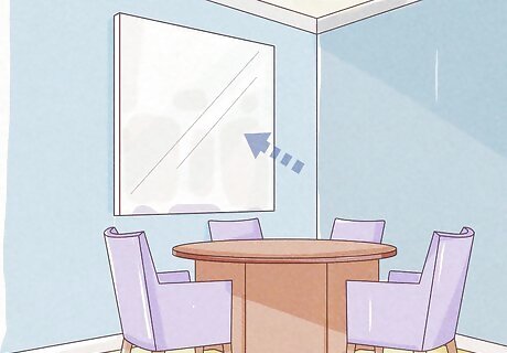 Hang mirrors to enlarge the space. If you want to make a small dining room appear larger, hang a large mirror on a wall. Try to hang it on the wall that's opposite from a window so the mirror will reflect more light. You could also hang lots of smaller mirrors in different sizes to create an interesting effect. Choose mirrors with frames that match the style of the room. For example, if you're decorating an elegant dining room, choose a mirror with a thick silver or gold frame. Or if you're decorating a vintage kitchen, look for a mirror at your local antique store. A great place to put a mirror is above a buffet table.